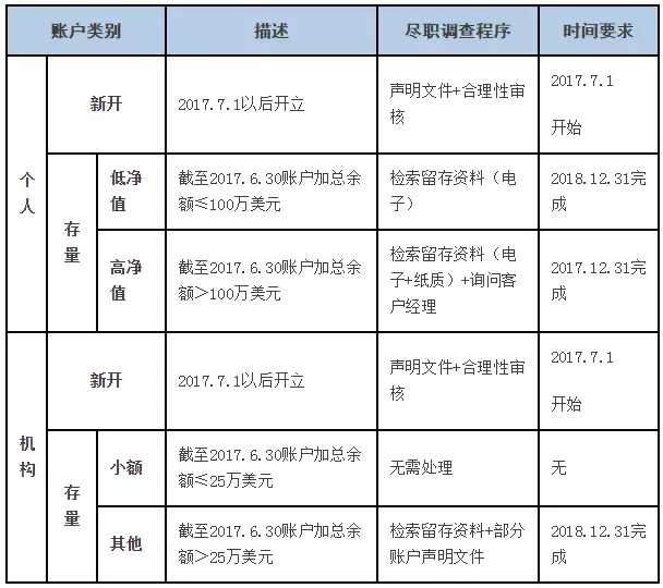 賬戶調(diào)查時間2017年12月31日前,完成對存量個人高凈值賬戶(截至2016年12月31日金融賬戶加總余額超過100萬美元)的盡職調(diào)查;