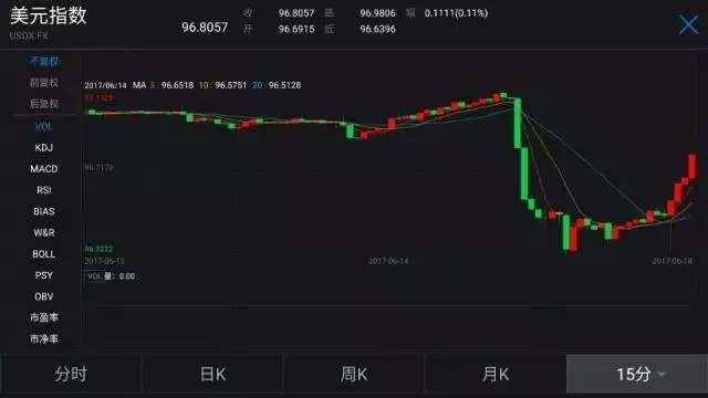 在市場(chǎng)表現(xiàn)方面(以下市場(chǎng)表現(xiàn)均截至北京時(shí)間3:30分),與今年3月加息時(shí)的走勢(shì)相似,美元指數(shù)再次出現(xiàn)大幅波動(dòng)的情況。在美聯(lián)儲(chǔ)公布利率決議前半個(gè)小時(shí)左右,美元指數(shù)突然出現(xiàn)大幅跳水,一度從97.07點(diǎn)跌至96.32的低點(diǎn)。在耶倫新聞發(fā)布會(huì)開(kāi)始后,美元指數(shù)快速反彈至96.81點(diǎn)附近。